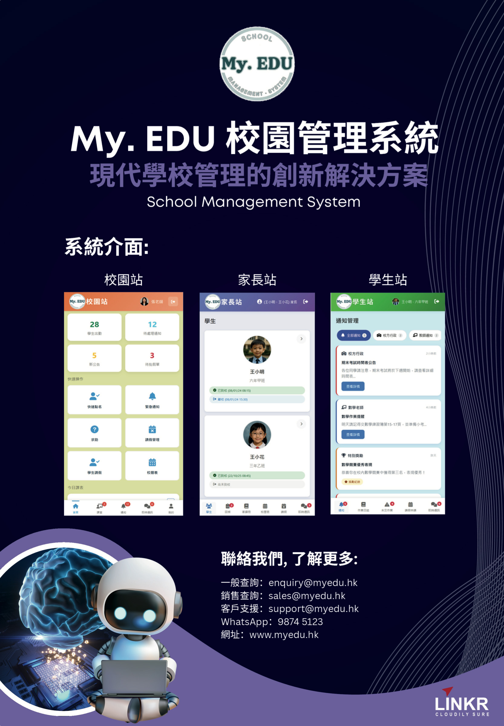 Our backend management platform streamlines user management, tracks grades and attendance, facilitates communication, and generates reports, ensuring efficient administration and enhancing collaboration among students, parents, and teachers in one solution.